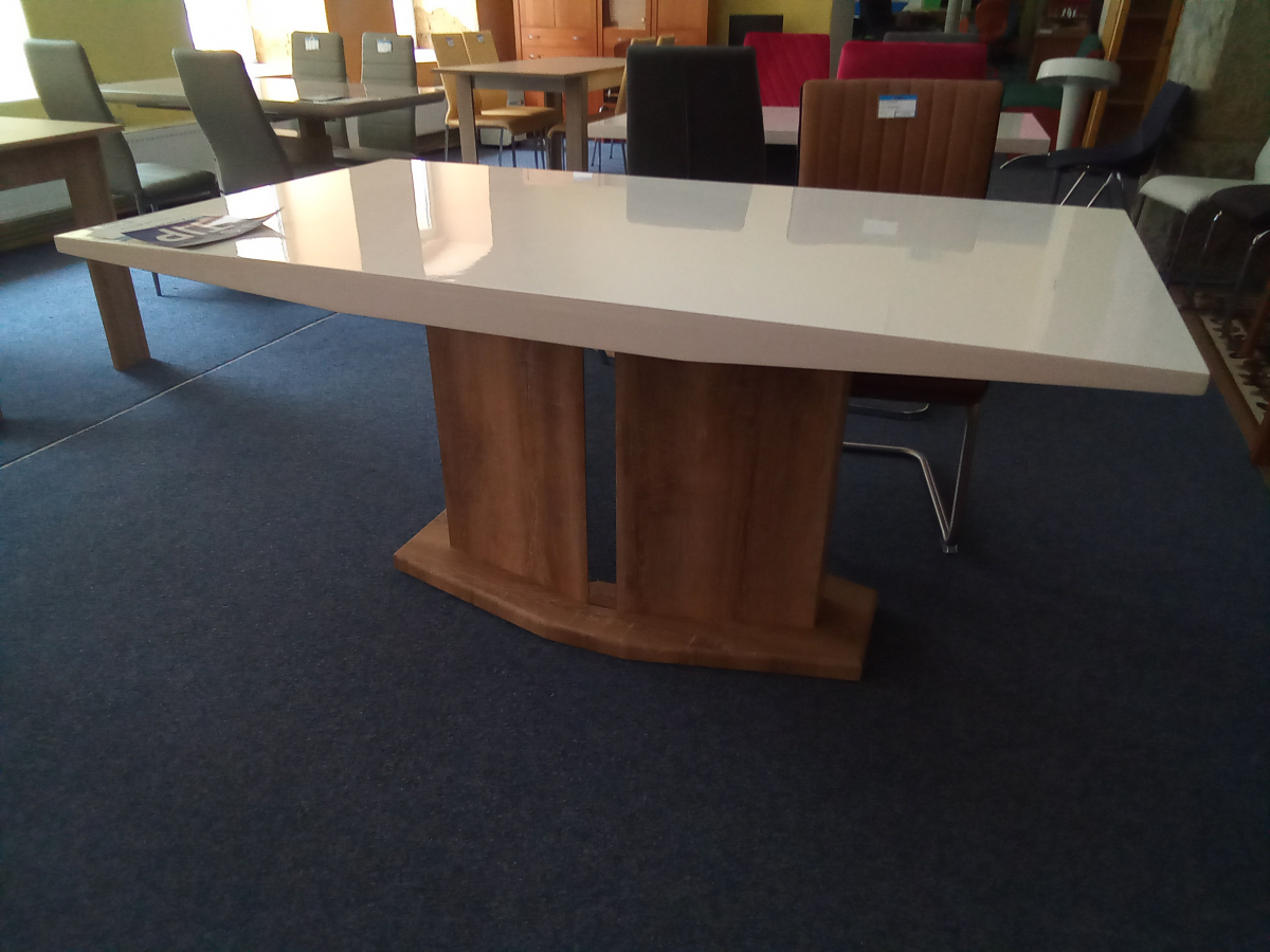 Moderní nerozkládací jídelní stůl na centrální noze v provedení CANYON GREY. Deska je ve vysokém lesku v bílé barvě. Zajímavý a moderní tvar podnože v barevném provedení dub. Stůl se bude perfektně vyjímat v moderních kuchyních či jídelnách.