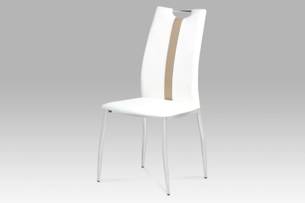 Velmi pohodlná a atraktivní jídelní židle zaujme hned na první pohled, a rozhodně bude skvělou volbou do vaší kuchyně. Opěrák je očalouněn oblíbenou ekokůží v bílé barvě s moderním pruhem v béžové barvě uprostřed opěráku. Manipulace s žídlí je díky její lehké váze a především praktickému madlu na vršku židle velmi snadná. Židle je nenáročná na údržbu.