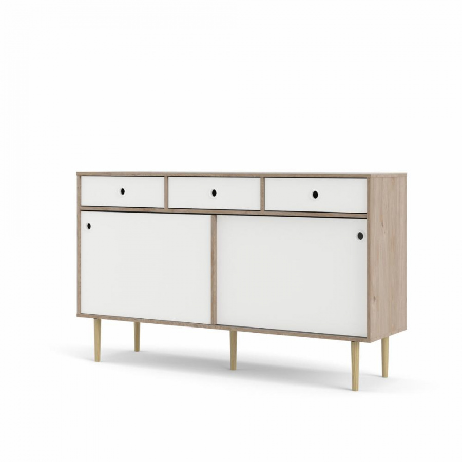 Komoda Ruby díky svému provední nabízí univerzální použití a dostatek úložného prostoru. S touto komodou budete mít doma přehledný a organizovaný pořádek. A pokud máte rádi retro styl, pak je tato komoda pro Vás jako stvořená. Komoda je zhotovená z lamina které je odolné a snadné na údržbu. Retro vzhled zdůrazňují vysoké nožky, kulaté výřezy místo úchytek a posuvné dvířka. Komodu nabízíme ve dvou barevných provedeních. Je dodávaná v demontu a součástí je montážní plánek včetně všech potřebných spojovacích materiálů. Vlivem nastavení monitorů, nebo displejů telefonů, se zobrazení barev na fotograii může od skutečnosti lišit. Vyobrazené dopňky a dekorace nejsou v ceně. Nábytek je dodáván z Dánska, proto doporučujeme ověřit dostupnost zboží.