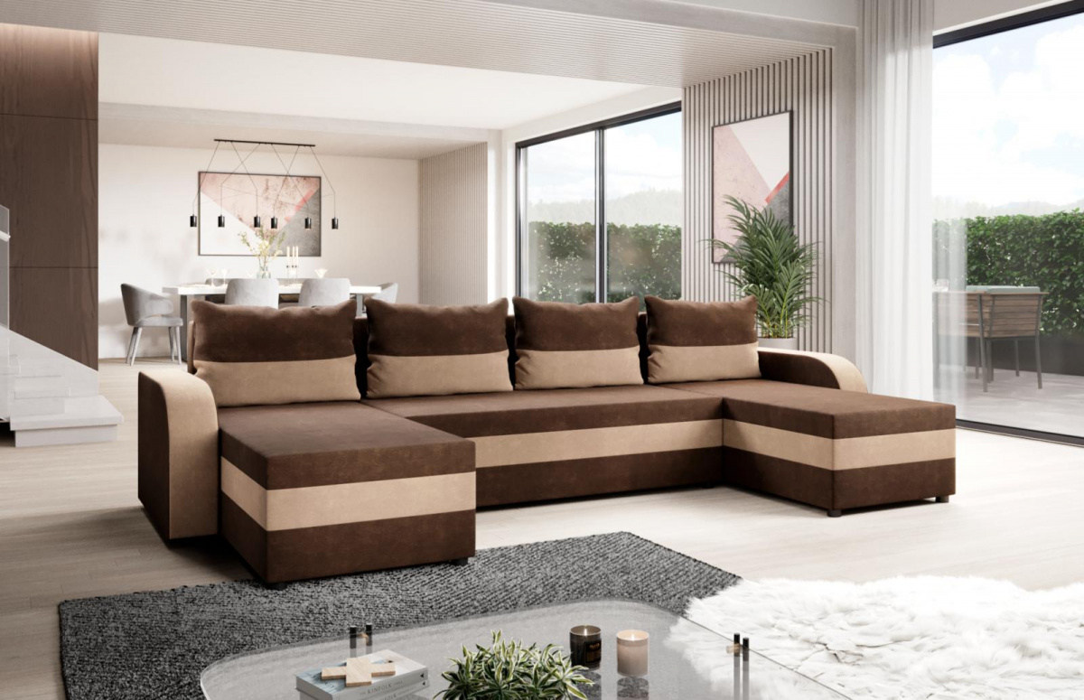 Sedací souprava Hermiona ve tvaru U, osloví každého, kdo preferuje moderní vzhled a zároveň pohodlí a praktičnost. Sedací souprava je velmi pohodlná a dostatečně velká na posezení s přáteli, nebo rodinou. Sedací souprava je rozkládací. Jednoduše sedačku přeměníte na lůžko k občasnému přespání Vaší návštěvy. Samozřejmostí je i úložný prostor, který můžete využít např. na přikrývku a polštář. Sedací souprava je potažena kvalitní potahovou látkou v několika barevných provedeních. Vlivem nastavení monitorů, nebo displejů telefonů, se zobrazení barev na fotograii může od skutečnosti lišit. Vyobrazené dopňky a dekorace nejsou v ceně.