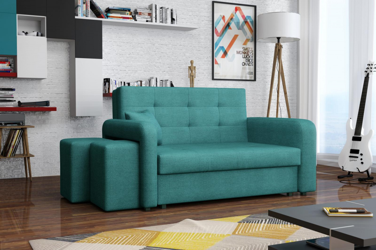 Rozkládací pohovka Vivian je díky svým rozměrům vhodná i do menších pokojů. Své uplatnění najde nejen v obývacím pokoji, ale také v dětském, studentském, nebo hostinském pokoji. Jednoduchým rozložením pomocí automatu, získáte lůžko k příležitostnému přespání Vaší návštěvy. Výplň sedáku tvoří vlnité pružiny v kombinaci s PUR pěnou. Pohovka je potažena kvalitní látkou a nabízíme ji v několika trendy odstínech. Pohovka disponuje i nepostradatelným úložným prostorem, který využijete např. na deku a polštář. V ceně pohovky je 1 dekorační polštář a 2 taburety, které jsou důmyslně uložené v područi pohovky. Taburety můžety využít k sezení, nebo k podepření nohou při odpočinku. Ostatní vyobrazené dekorace nejsou v ceně. Vlivem nastavení monitorů, nebo displejů telefonů, se zobrazení barev na fotograii může od skutečnosti lišit. Vyobrazené dopňky a dekorace nejsou v ceně.