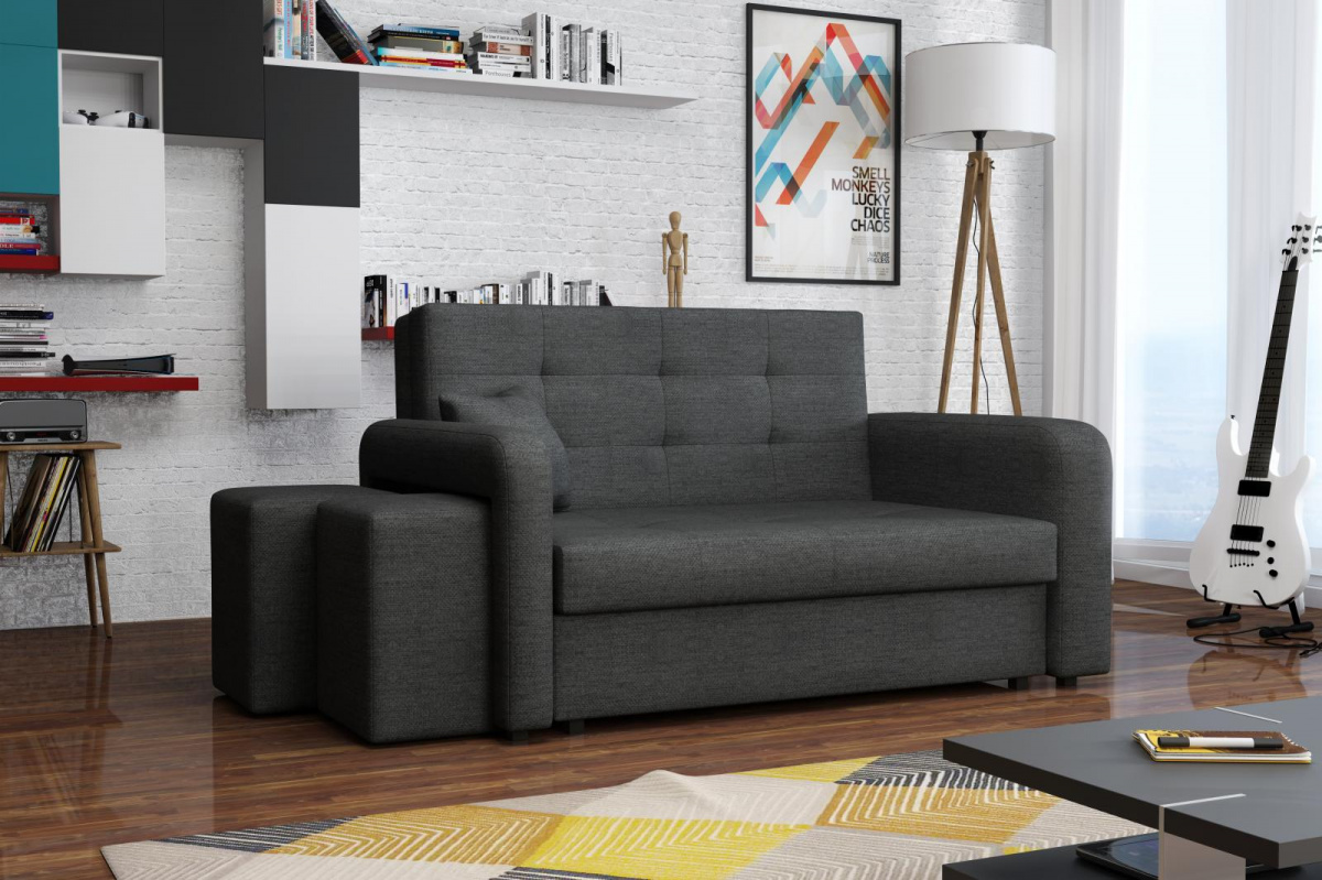 Rozkládací pohovka Vivian je díky svým rozměrům vhodná i do menších pokojů. Své uplatnění najde nejen v obývacím pokoji, ale také v dětském, studentském, nebo hostinském pokoji. Jednoduchým rozložením pomocí automatu, získáte lůžko k příležitostnému přespání Vaší návštěvy. Výplň sedáku tvoří vlnité pružiny v kombinaci s PUR pěnou. Pohovka je potažena kvalitní látkou a nabízíme ji v několika trendy odstínech. Pohovka disponuje i nepostradatelným úložným prostorem, který využijete např. na deku a polštář. V ceně pohovky je 1 dekorační polštář a 2 taburety, které jsou důmyslně uložené v područi pohovky. Taburety můžety využít k sezení, nebo k podepření nohou při odpočinku. Ostatní vyobrazené dekorace nejsou v ceně. Vlivem nastavení monitorů, nebo displejů telefonů, se zobrazení barev na fotograii může od skutečnosti lišit. Vyobrazené dopňky a dekorace nejsou v ceně.