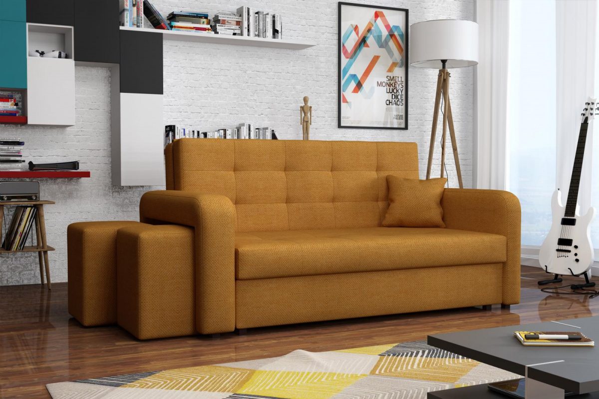 Rozkládací pohovka Vivian je díky svým rozměrům vhodná i do menších pokojů. Své uplatnění najde nejen v obývacím pokoji, ale také v dětském, studentském, nebo hostinském pokoji. Jednoduchým rozložením pomocí automatu, získáte lůžko k příležitostnému přespání Vaší návštěvy. Výplň sedáku tvoří vlnité pružiny v kombinaci s PUR pěnou. Pohovka je potažena kvalitní látkou a nabízíme ji v několika trendy odstínech. Pohovka disponuje i nepostradatelným úložným prostorem, který využijete např. na deku a polštář. V ceně pohovky je 1 dekorační polštář a 2 taburety, které jsou důmyslně uložené v područi pohovky. Taburety můžety využít k sezení, nebo k podepření nohou při odpočinku. Ostatní vyobrazené dekorace nejsou v ceně. Vlivem nastavení monitorů, nebo displejů telefonů, se zobrazení barev na fotograii může od skutečnosti lišit. Vyobrazené dopňky a dekorace nejsou v ceně.