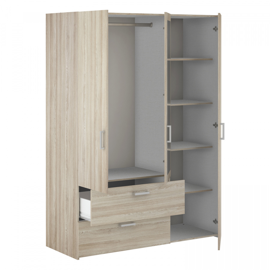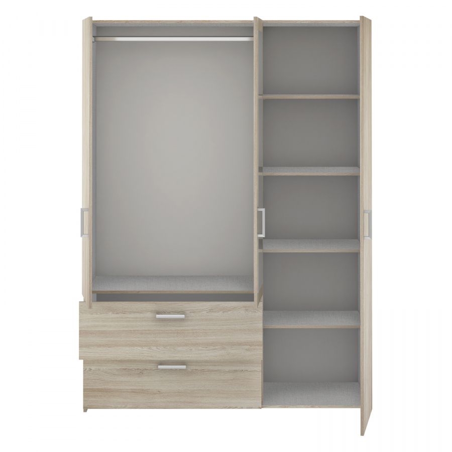 v širší části šatní tyč, dvě velké zásuvky s kovovými pojezdy