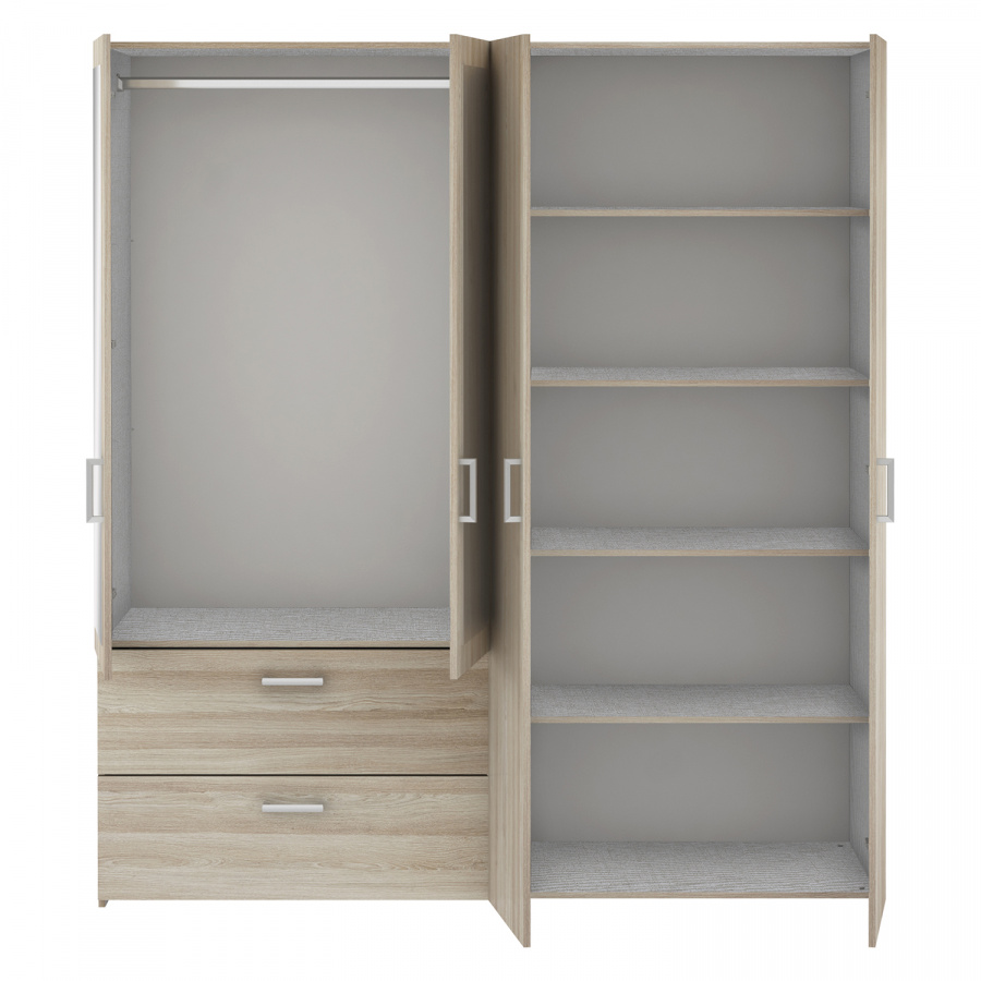 v levé části šatní tyč, dvě velké zásuvky s kovovými pojezdy