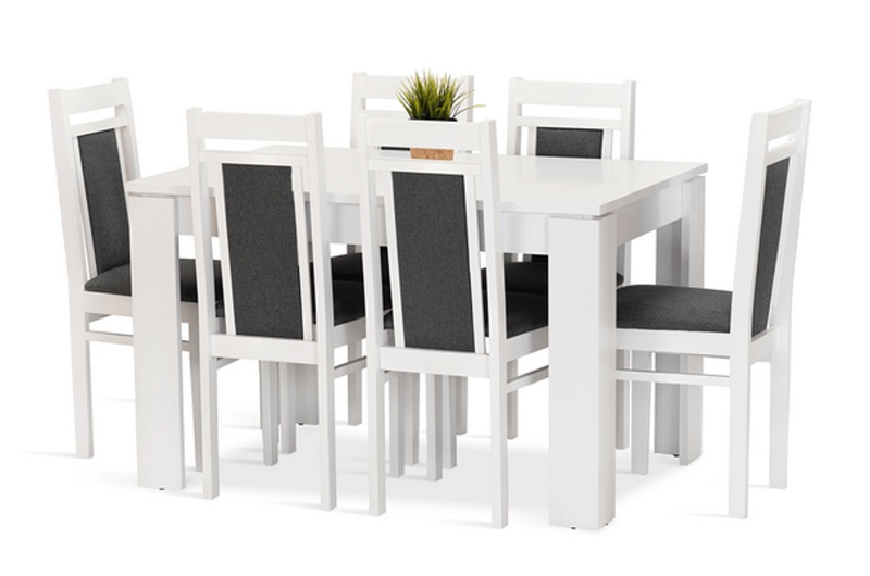 Jídelní sestava Akord 6 se skládá ze stolu a šesti židlí. Tato jídelní sestava splní svůj účel na výbornou nejen v kuchyni, ale i v jídelně, nebo obývacím pokoji s jídelním koutem. Svou vysokou kvalitou a precizním zpracováním, uspokojí všechny budoucí, i ty velmi náročné, uživatele. Stůl je vyrobený z bílého matného lamina tl.22 mm, kostry židlí z bukového dřeva, barveného na bílou barvu. Jídelní sestava je dodávaná v demontu. Součástí balení je schématický montážní návod, včetně všech potřebných spojovacích prvků. Cena je uvedena za jídelní stůl a 6 židlí. Vlivem nastavení monitorů, nebo displejů telefonů, se zobrazení barev na fotograii může od skutečnosti lišit.