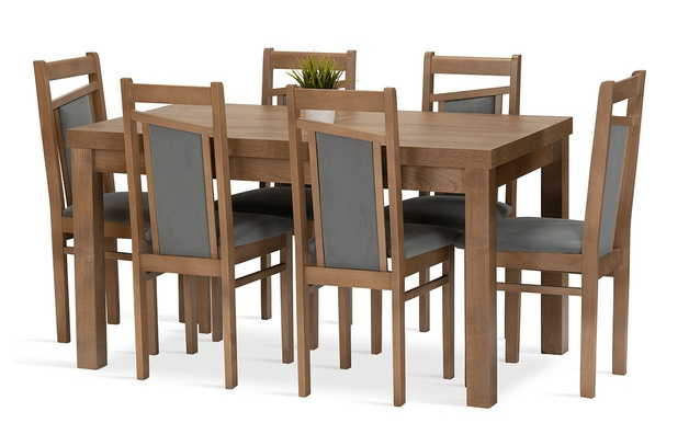 Jídelní sestava Magnum 6 se skládá z rozkládacího stolu a šesti židlí. Tato jídelní sestava splní svůj účel na výbornou nejen v kuchyni, ale i v jídelně, nebo obývacím pokoji s jídelním koutem. Svou vysokou kvalitou a precizním zpracováním, uspokojí všechny budoucí, i ty velmi náročné, uživatele. Nohy stolu a kostry židlí jsou vyrobeny z bukového dřeva, mořeného tak, aby ladily s deskou stolu, která je vyrobená z lamina v dekoru dub lefkas. Jídelní sestava je dodávaná v demontu. Součástí balení je schématický montážní návod, včetně všech potřebných spojovacích prvků. Cena je uvedena za jídelní stůl a 6 židlí. Vlivem nastavení monitorů, nebo displejů telefonů, se zobrazení barev na fotograii může od skutečnosti lišit. Úvodní fotografie je ilustrační. Židle budou dodány v modré barvě.