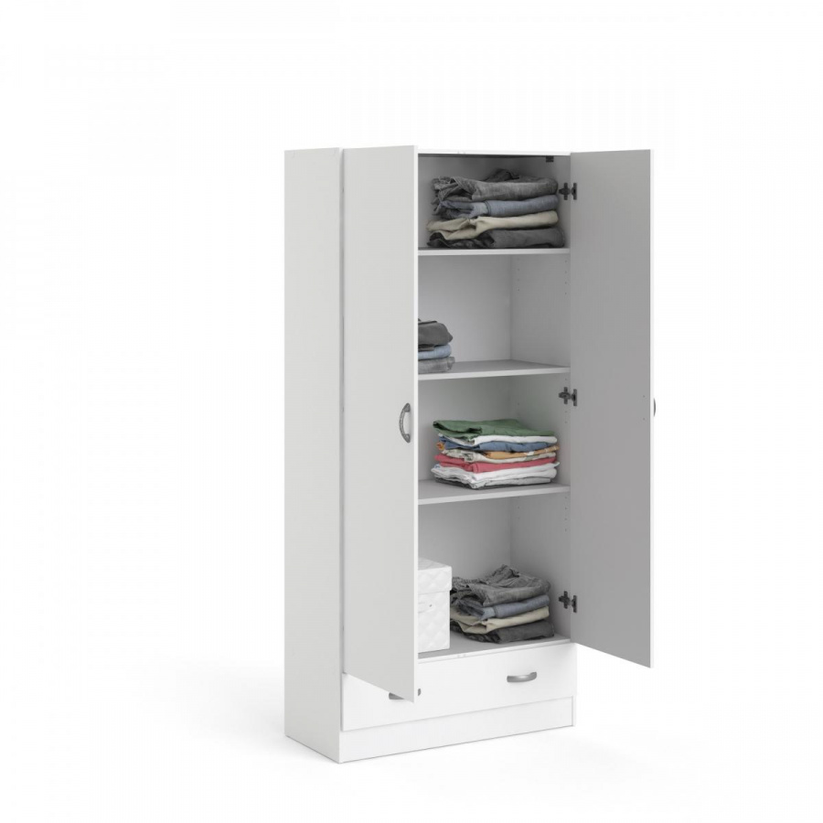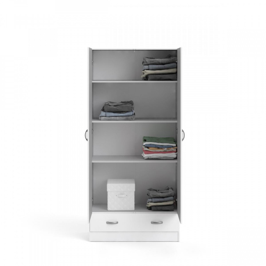 Policová skříň Pegi s praktickou zásuvkou splňuje veškeré požadavky pro ukládání oblečení. Vnitřní uspořádání skříně poskytuje dostatek prostoru na oblečení. Skříň má univerzální využití a je vyrobena z lamina, které je odolné a snadné na údržbu. Skříň je dodávaná v demontu a součástí je montážní plánek včetně všech potřebných spojovacích materiálů.