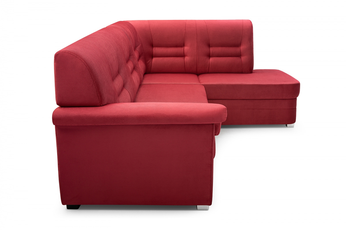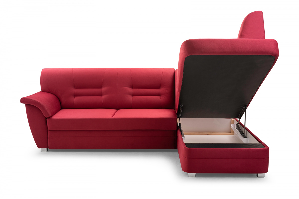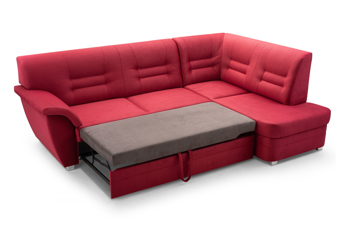 Moderní rohová sedací souprava Dornia je rozkládací. Jednoduchým rozkladem vzniká lůžko vhodné k příležitostnému spaní. Má uložný prostor, který lze využít například na lůžkoviny. Sedací souprava je pružinová v kombinaci s kvalitní PUR pěnou. Je celočalouněná a je možno ji umístit také do prostoru.