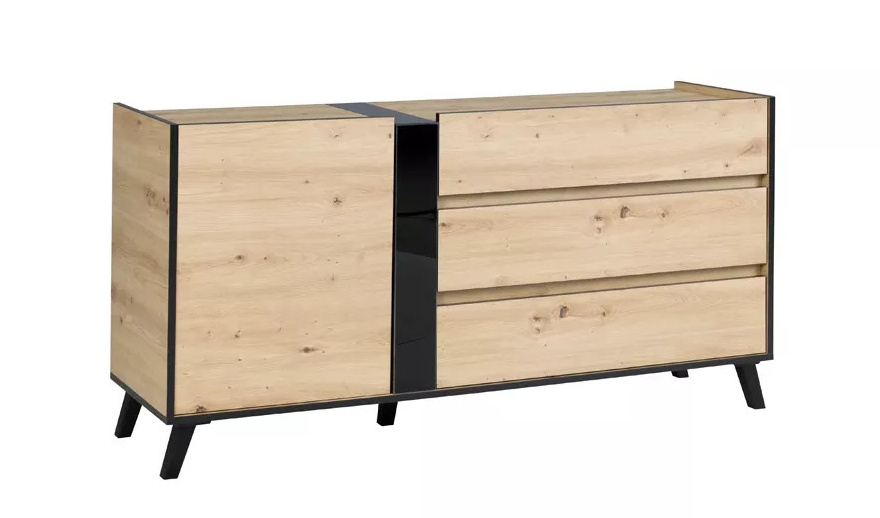 Komoda Flint R3 je vyrobena z lamina v krásném dekoru dub artisan v kombinaci s černou. Lamino je odolné a jistě oceníte i velmi snadnou údržbu. Komoda má v jedné části tři šuplíky a ve druhé půlce má dvířka. Komoda je dodávaná v demontu. Součástí balení je montážní návod včetně všech spojovacích prvků.