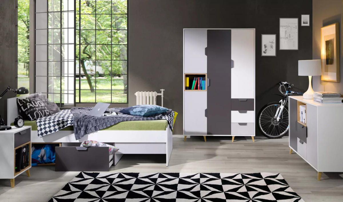 Sestava se skládá z postele s čely a úložným prostorem, nočního stolku, skříně a komody. Postel je možno objednat v levém, nebo pravém provedení. Na fotografii je levé provedení. Součástí postele je laťkový rošt a úložný prostor. Matrace a vyobrazené dekorace nejsou v ceně.
