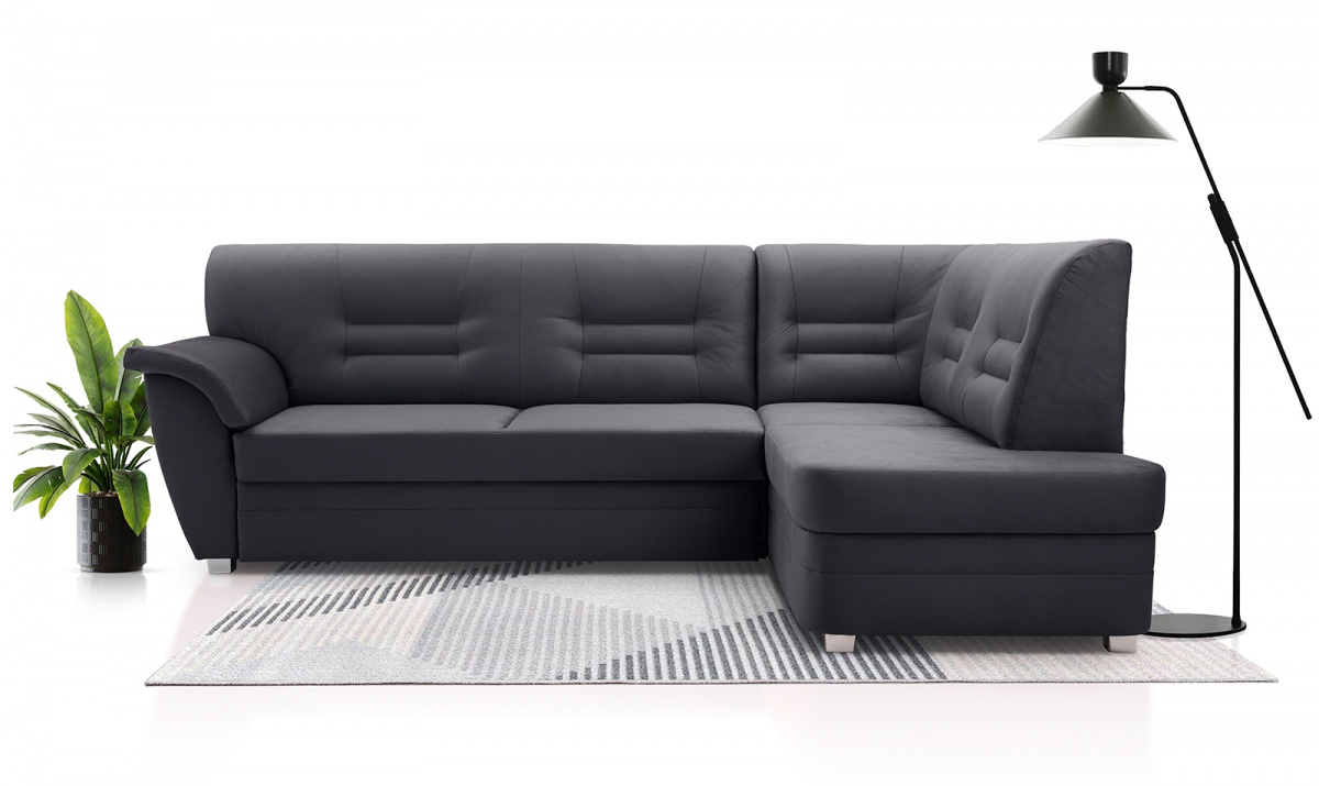 Moderní rohová sedací souprava Dornia je rozkládací. Jednoduchým rozkladem vzniká lůžko vhodné k příležitostnému spaní. Má uložný prostor, který lze využít například na lůžkoviny. Sedací souprava je pružinová v kombinaci s kvalitní PUR pěnou. Je celočalouněná a je možno ji umístit také do prostoru.