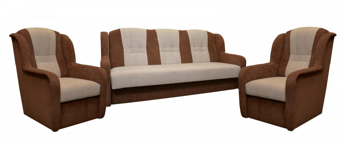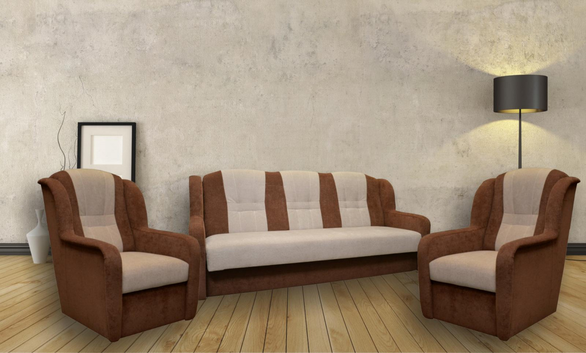 Ušák je stále velmi oblíbeným klasickým modelem sedací soupravy v provedení 3F+1+1. Je velmi pohodlná a zároveň praktická. Sedací souprava je rozkládací a samozřejmostí je i úložný prostor. Jednoduchým rozkladem pomocí systému "klik klak" vznikne lůžko k příležitostnému přespání Vaší návštěvy. Sedací souprava je potažena kvalitní látkou a nabízíme ji v několika barvách, ze kterých si určitě vyberete tu nejvhodnější pro Váš obývací pokoj. Výplň sedáků tvoří pružiny v kombinaci s kvalitní PUR pěnou. Tato kombinace zajistí velmi pohodlné sezení. Cena sedací soupravy je uvedena za rozkládací trojsed a dvě křesla. Zobrazení barev na fotografii se může od skutečnosti lišit.