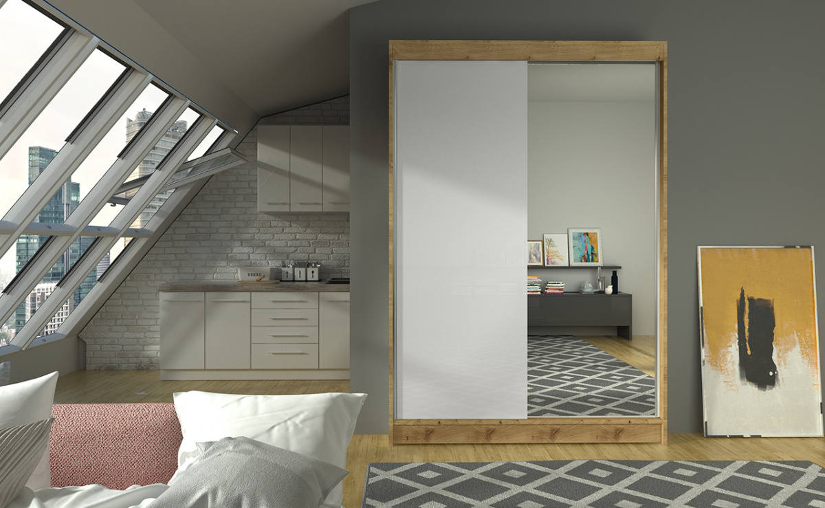 Skříň je vyrobena z kvalitního lamina. Díky svému vnitřnímu uspořádání nabízí dostatek úložného prostoru, posuvné dveře šetří prostor a zrcadlo ho opticky zvětšuje. Skříň je vhodná do ložnice, dětského nebo studentského pokoje, do předsíně i kanceláře. Vnitřní uspořádání skříně je vyobrazeno na fotografii. Skříň je dodávána v demontu a součástí je montážní plánek včetně všech potřebných spojovacích materiálů. Vyobrazené dekorace nejsou v ceně.