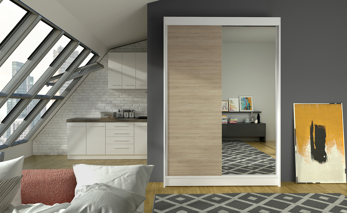 Skříň je vyrobena z kvalitního lamina. Díky svému vnitřnímu uspořádání nabízí dostatek úložného prostoru, posuvné dveře šetří prostor a zrcadlo ho opticky zvětšuje. Skříň je vhodná do ložnice, dětského nebo studentského pokoje, do předsíně i kanceláře. Vnitřní uspořádání skříně je vyobrazeno na fotografii. Skříň je dodávána v demontu a součástí je montážní plánek včetně všech potřebných spojovacích materiálů. Vyobrazené dekorace nejsou v ceně.