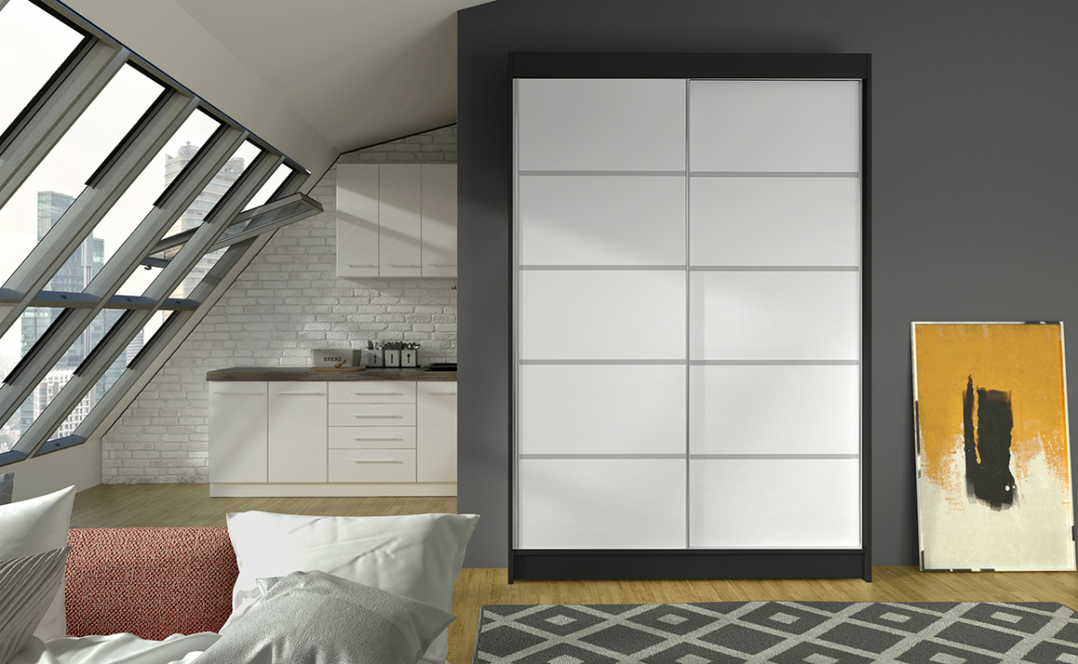 Skříň je vyrobena z kvalitního lamina. Díky svému vnitřnímu uspořádání nabízí dostatek úložného prostoru, posuvné dveře šetří prostor a zrcadlo ho opticky zvětšuje. Skříň je vhodná do ložnice, dětského nebo studentského pokoje, do předsíně i kanceláře. Vnitřní uspořádání skříně je vyobrazeno na fotografii. Skříň je dodávána v demontu a součástí je montážní plánek včetně všech potřebných spojovacích materiálů. Vyobrazené dekorace nejsou v ceně.