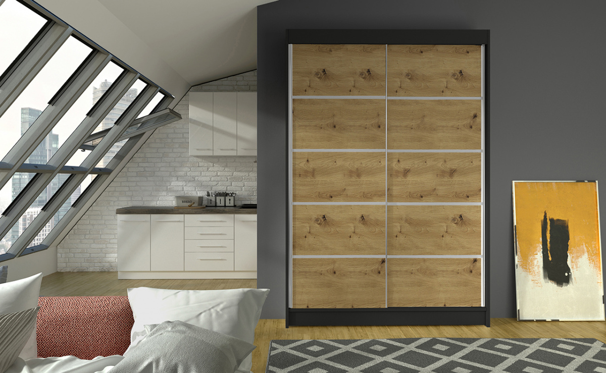 Skříň je vyrobena z kvalitního lamina. Díky svému vnitřnímu uspořádání nabízí dostatek úložného prostoru, posuvné dveře šetří prostor a zrcadlo ho opticky zvětšuje. Skříň je vhodná do ložnice, dětského nebo studentského pokoje, do předsíně i kanceláře. Vnitřní uspořádání skříně je vyobrazeno na fotografii. Skříň je dodávána v demontu a součástí je montážní plánek včetně všech potřebných spojovacích materiálů. Vyobrazené dekorace nejsou v ceně.