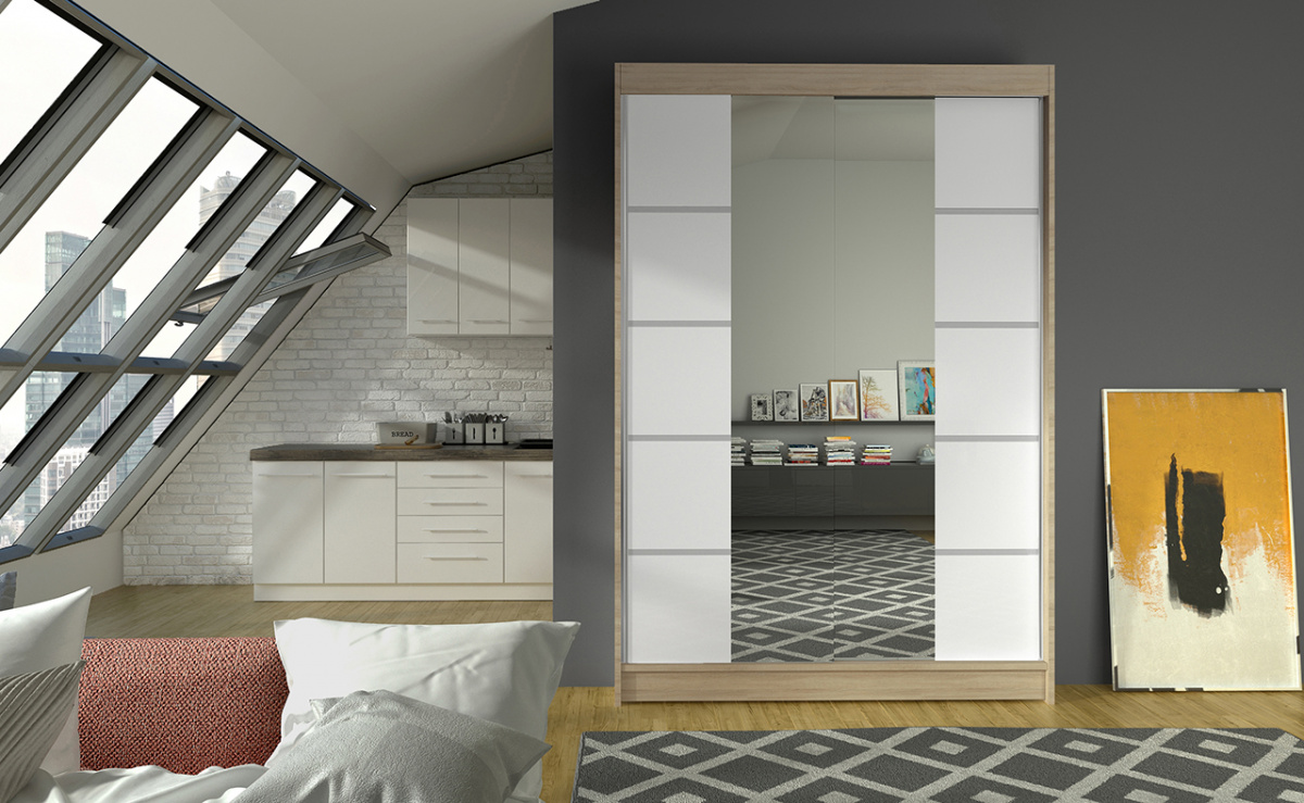 Skříň je vyrobena z kvalitního lamina. Díky svému vnitřnímu uspořádání nabízí dostatek úložného prostoru, posuvné dveře šetří prostor a zrcadlo ho opticky zvětšuje. Skříň je vhodná do ložnice, dětského nebo studentského pokoje, do předsíně i kanceláře. Vnitřní uspořádání skříně je vyobrazeno na fotografii. Skříň je dodávána v demontu a součástí je montážní plánek včetně všech potřebných spojovacích materiálů. Vyobrazené dekorace nejsou v ceně.