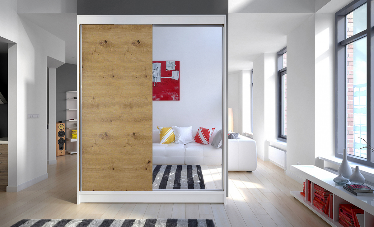 Skříň je vyrobena z kvalitního lamina. Díky svému vnitřnímu uspořádání nabízí dostatek úložného prostoru, posuvné dveře šetří prostor a zrcadlo ho opticky zvětšuje. Skříň je vhodná do ložnice, dětského nebo studentského pokoje, do předsíně i kanceláře. Vnitřní uspořádání skříně je vyobrazeno na fotografii. Skříň je dodávána v demontu a součástí je montážní plánek včetně všech potřebných spojovacích materiálů. Vyobrazené dekorace nejsou v ceně.