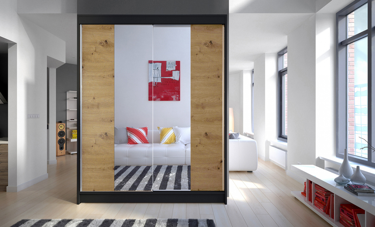 Skříň je vyrobena z kvalitního lamina. Díky svému vnitřnímu uspořádání nabízí dostatek úložného prostoru, posuvné dveře šetří prostor a zrcadlo ho opticky zvětšuje. Skříň je vhodná do ložnice, dětského nebo studentského pokoje, do předsíně i kanceláře. Vnitřní uspořádání skříně je vyobrazeno na fotografii. Skříň je dodávána v demontu a součástí je montážní plánek včetně všech potřebných spojovacích materiálů. Vyobrazené dekorace nejsou v ceně.