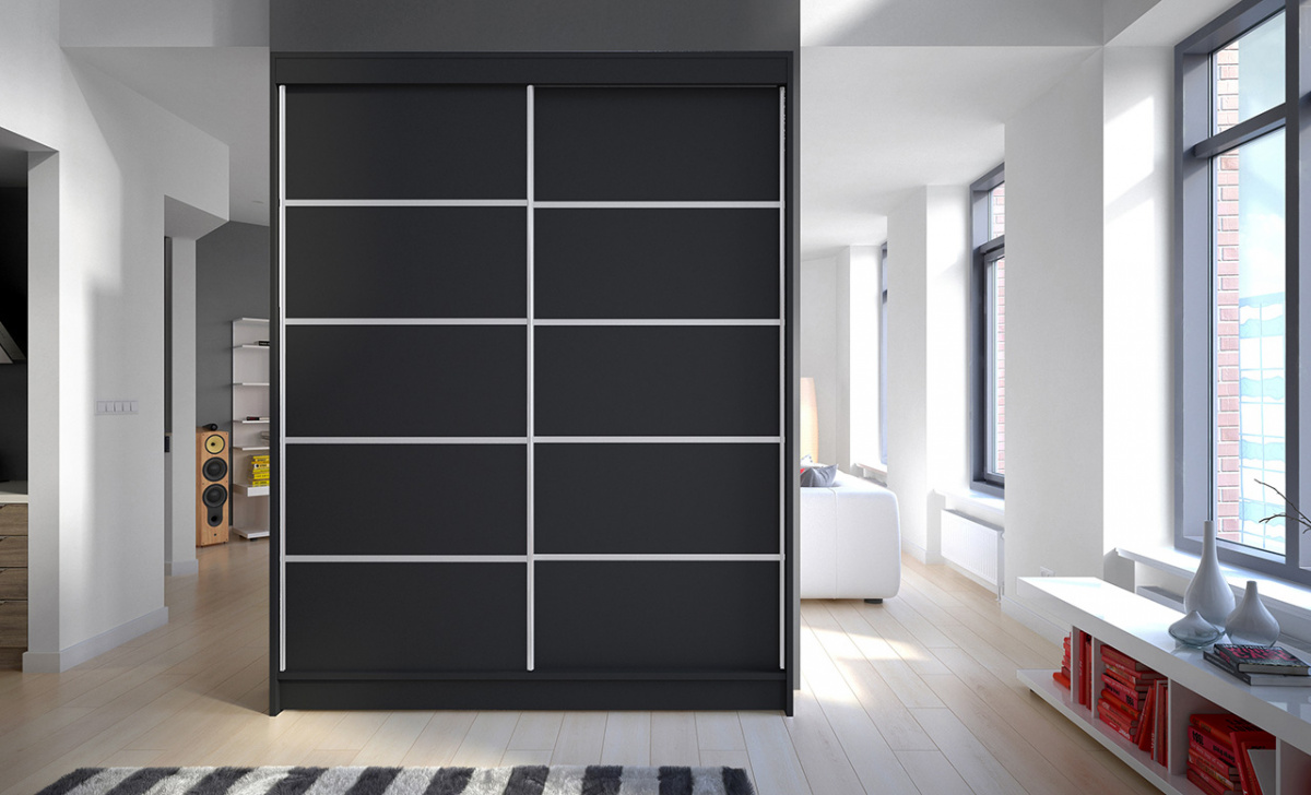 Skříň je vyrobena z kvalitního lamina. Díky svému vnitřnímu uspořádání nabízí dostatek úložného prostoru, posuvné dveře šetří prostor a zrcadlo ho opticky zvětšuje. Skříň je vhodná do ložnice, dětského nebo studentského pokoje, do předsíně i kanceláře. Vnitřní uspořádání skříně je vyobrazeno na fotografii. Skříň je dodávána v demontu a součástí je montážní plánek včetně všech potřebných spojovacích materiálů. Vyobrazené dekorace nejsou v ceně.