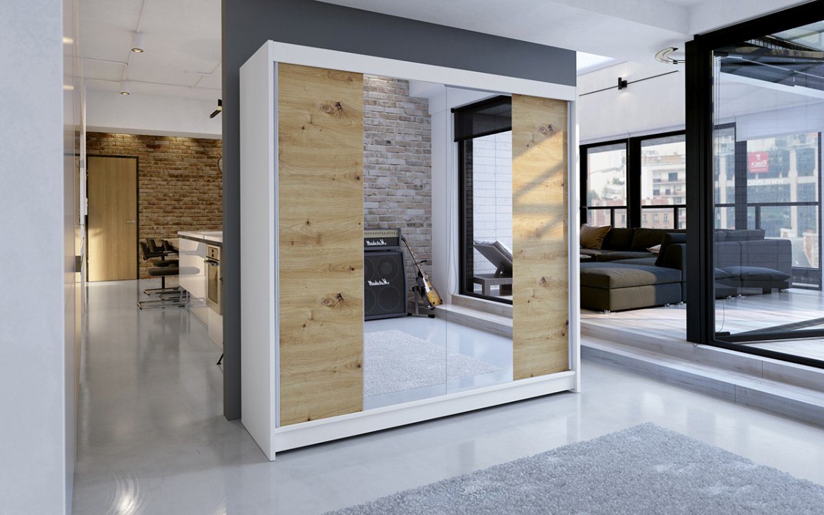 Skříň je vyrobena z kvalitního lamina. Díky svému vnitřnímu uspořádání nabízí dostatek úložného prostoru, posuvné dveře šetří prostor a zrcadlo ho opticky zvětšuje. Skříň je vhodná do ložnice, dětského nebo studentského pokoje, do předsíně i kanceláře. Vnitřní uspořádání skříně je vyobrazeno na fotografii. Skříň je dodávána v demontu a součástí je montážní plánek včetně všech potřebných spojovacích materiálů. Vyobrazené dekorace nejsou v ceně.