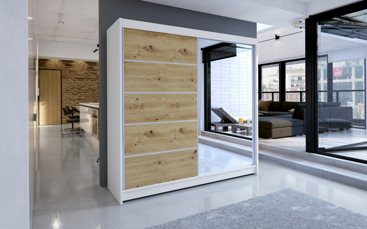 Skříň je vyrobena z kvalitního lamina. Díky svému vnitřnímu uspořádání nabízí dostatek úložného prostoru, posuvné dveře šetří prostor a zrcadlo ho opticky zvětšuje. Skříň je vhodná do ložnice, dětského nebo studentského pokoje, do předsíně i kanceláře. Vnitřní uspořádání skříně je vyobrazeno na fotografii. Skříň je dodávána v demontu a součástí je montážní plánek včetně všech potřebných spojovacích materiálů. Vyobrazené dekorace nejsou v ceně.