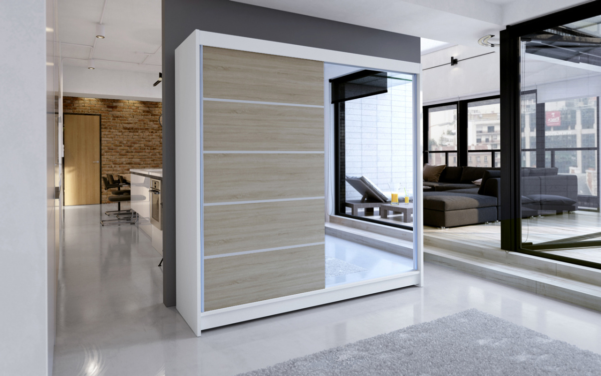 Skříň je vyrobena z kvalitního lamina. Díky svému vnitřnímu uspořádání nabízí dostatek úložného prostoru, posuvné dveře šetří prostor a zrcadlo ho opticky zvětšuje. Skříň je vhodná do ložnice, dětského nebo studentského pokoje, do předsíně i kanceláře. Vnitřní uspořádání skříně je vyobrazeno na fotografii. Skříň je dodávána v demontu a součástí je montážní plánek včetně všech potřebných spojovacích materiálů. Vyobrazené dekorace nejsou v ceně.
