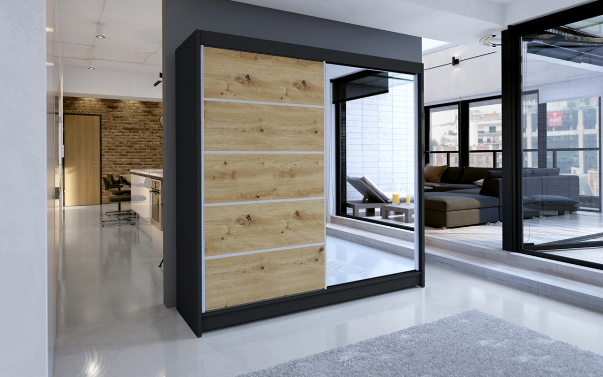 Skříň je vyrobena z kvalitního lamina. Díky svému vnitřnímu uspořádání nabízí dostatek úložného prostoru, posuvné dveře šetří prostor a zrcadlo ho opticky zvětšuje. Skříň je vhodná do ložnice, dětského nebo studentského pokoje, do předsíně i kanceláře. Vnitřní uspořádání skříně je vyobrazeno na fotografii. Skříň je dodávána v demontu a součástí je montážní plánek včetně všech potřebných spojovacích materiálů. Vyobrazené dekorace nejsou v ceně.