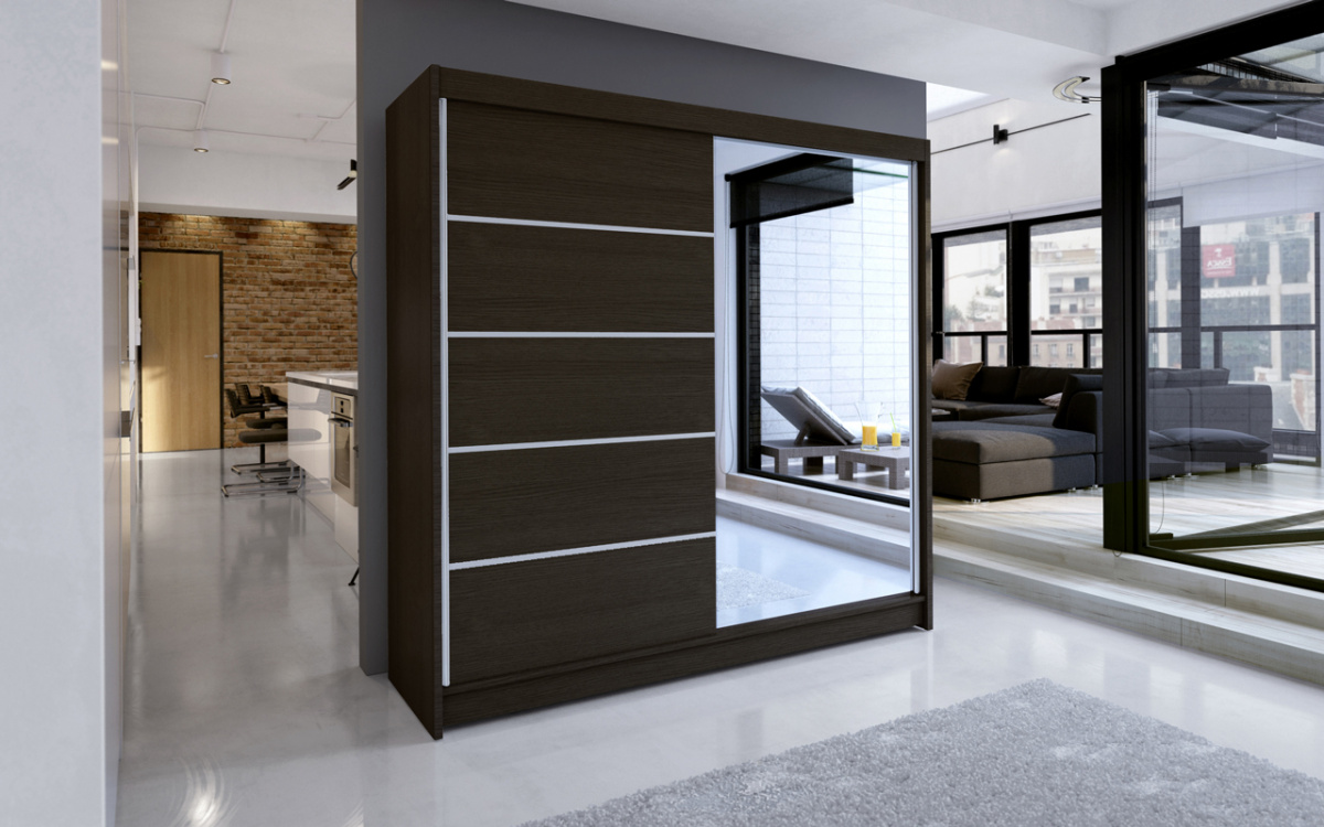 Skříň je vyrobena z kvalitního lamina. Díky svému vnitřnímu uspořádání nabízí dostatek úložného prostoru, posuvné dveře šetří prostor a zrcadlo ho opticky zvětšuje. Skříň je vhodná do ložnice, dětského nebo studentského pokoje, do předsíně i kanceláře. Vnitřní uspořádání skříně je vyobrazeno na fotografii. Skříň je dodávána v demontu a součástí je montážní plánek včetně všech potřebných spojovacích materiálů. Vyobrazené dekorace nejsou v ceně.
