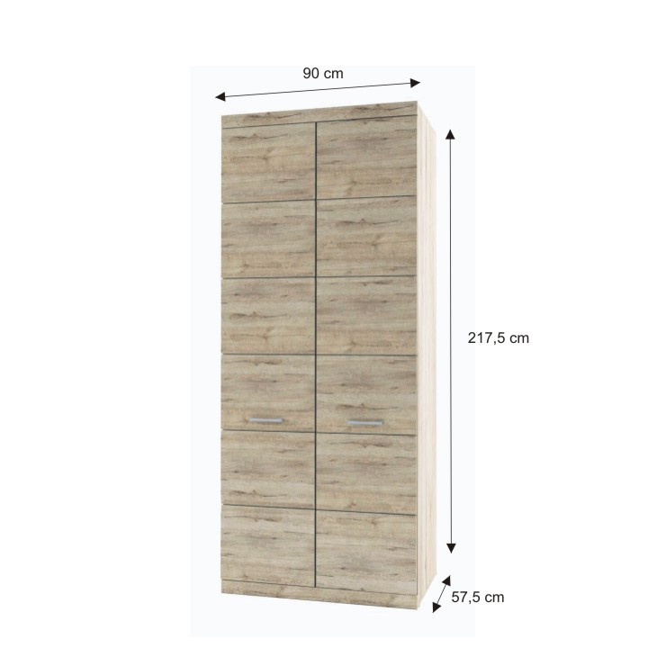 Věšáková skříň, dvoudveřová, Orestes materiál: DTD laminovaná / ABS hrany barva: dub san remo Rozměry (ŠxHxV): 90x57,5x217,5 cm Tloušťka materiálu: 16 mm Dodávané v demontu
