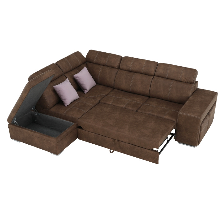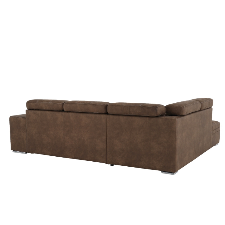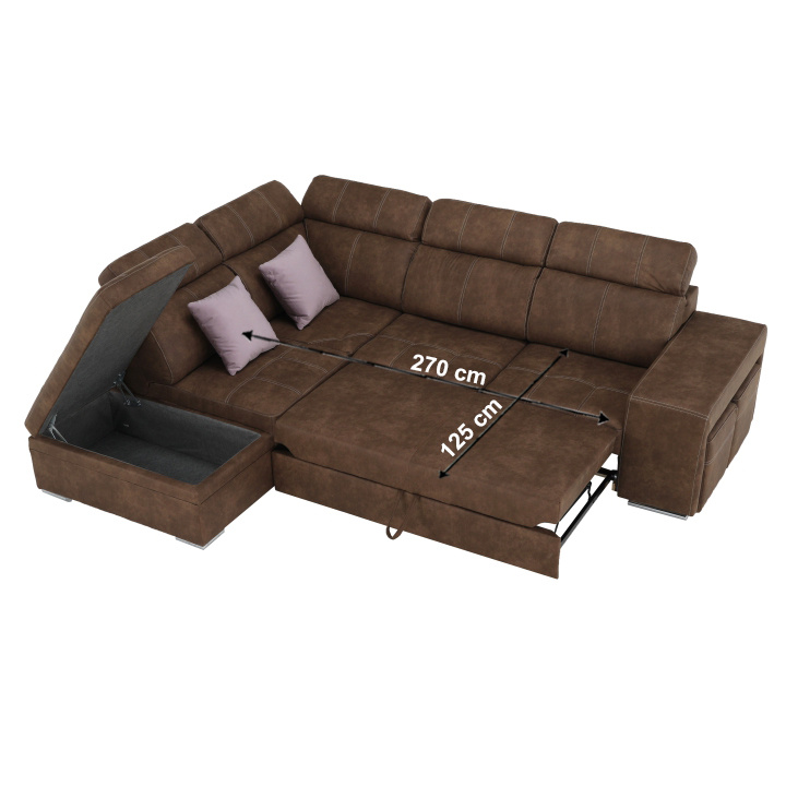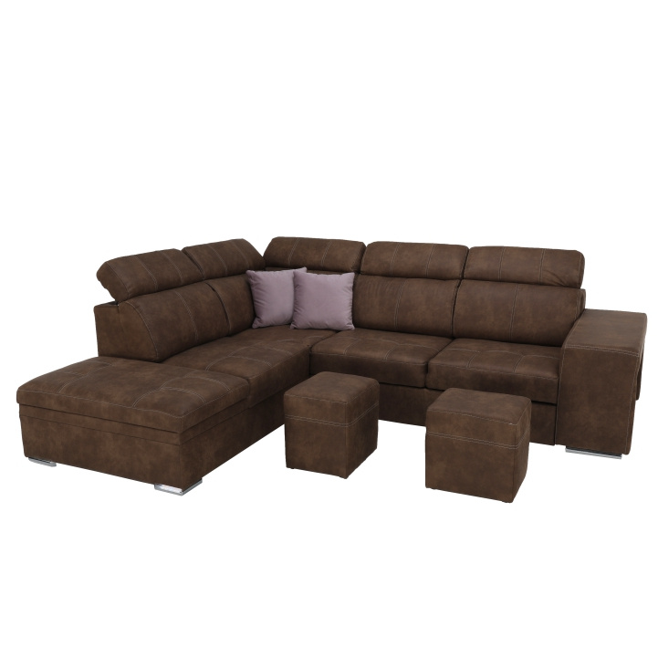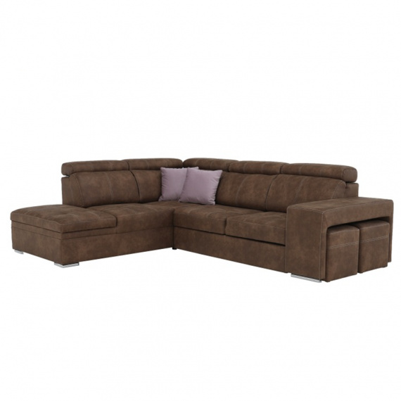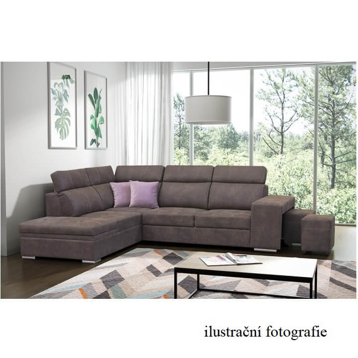 Celočalouněná rohová rozkládací sedací souprava s úložným prostorem a s polohovacím záhlavím.