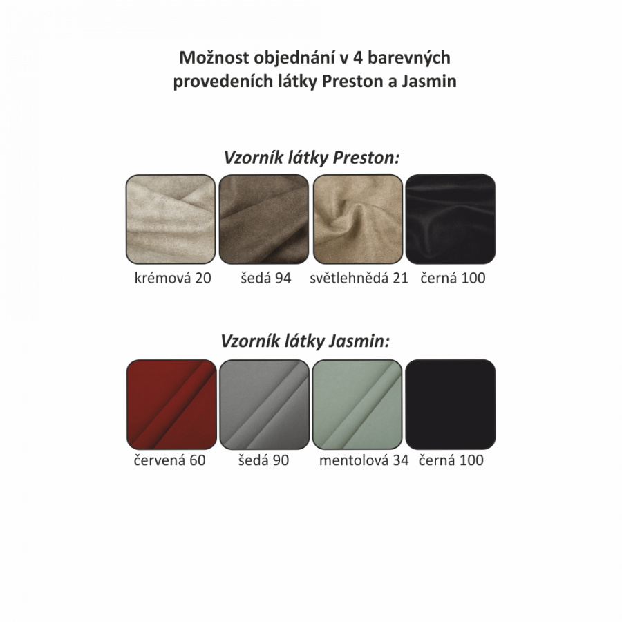 Máme pro vás hned čtyři barvy látky Preston a čtyři barvy látky Jasmine, kombinovat tedy můžete dle libosti. Cena sedačky na individuální objednávku je 33.690 Kč. Dodací doba 14-17týdnů.