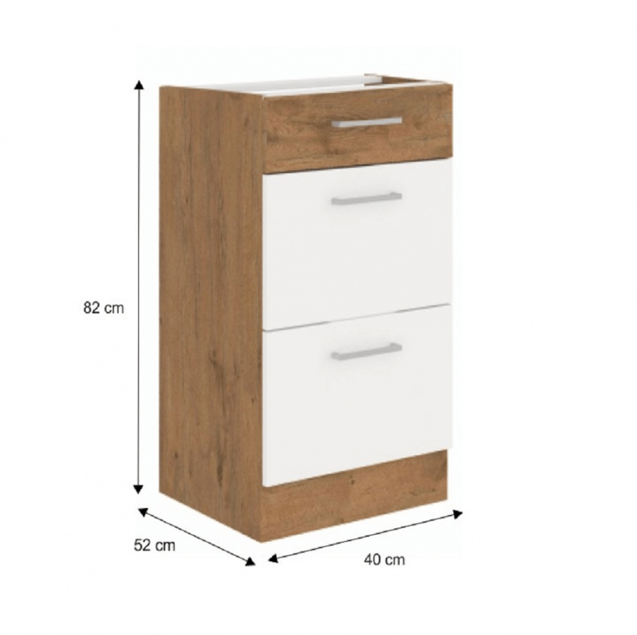 Spodní skříňka s 3 šuplíky VEGA D40 3S BB Materiál: DTD laminovaná / MDF Barva: dub lancelot / bílá extra vysoký lesk HG Rozměry (ŠxHxV): 40x52x82 cm Skříňka bez pracovní desky Systém tichého dorazu šuplíků Včetně spodní lišty Dodávané v demontu Možnost dokoupit pracovní desku dub lancelot v ceně: 1.150, - Kč / m. Možnost dokoupit univerzální L / P dřez v ceně 1.990, - Kč.