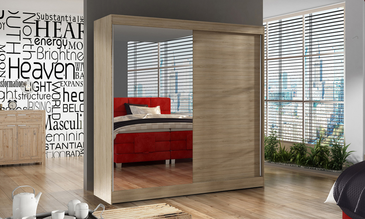 Skříň je vyrobena z kvalitního lamina. Díky svému vnitřnímu uspořádání nabízí dostatek úložného prostoru, posuvné dveře šetří prostor a zrcadlo ho opticky zvětšuje. Skříň je vhodná do ložnice, dětského nebo studentského pokoje, do předsíně i kanceláře. Vnitřní uspořádání skříně je vyobrazeno na fotografii. Skříň je dodávána v demontu. Součástí je i skleněné zrcadlo, které je nalepeno na jedné části dveří skříně a také montážní plánek včetně všech potřebných spojovacích materiálů. Vyobrazené dekorace nejsou v ceně.