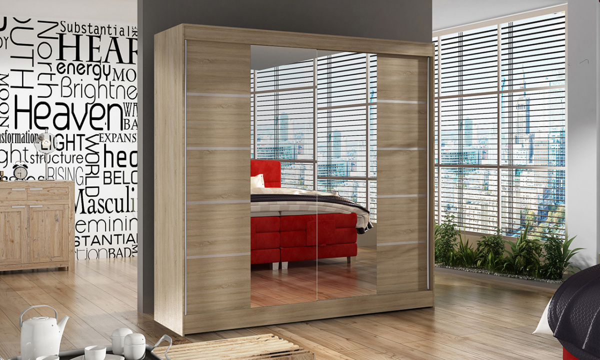 Skříň je vyrobena z kvalitního lamina. Díky svému vnitřnímu uspořádání nabízí dostatek úložného prostoru, posuvné dveře šetří prostor a zrcadlo ho opticky zvětšuje. Skříň je vhodná do ložnice, dětského nebo studentského pokoje, do předsíně i kanceláře. Vnitřní uspořádání skříně je vyobrazeno na fotografii. Skříň je dodávána v demontu. Součástí jsou i skleněná zrcadla, která jsou nalepena na dveřích skříně a také montážní plánek včetně všech potřebných spojovacích materiálů. Vyobrazené dekorace nejsou v ceně.