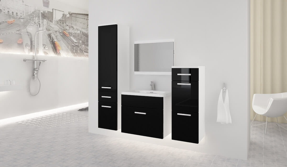 Moderní a jednoduchá koupelnová sestava, která splní svůj praktický i dekorativní účel. Sestava se skládá ze dvou závěsných skříněk, zrcadla a skříňky pod umyvadlo včetně umyvadla. Koupelnová sestava má plastové úchyty v šedé barvě. Sestava je vyrobena z lamina tloušťky 16 mm v bílém lesku, korpusy jsou také v bílém provedení tloušťky lamina 18 mm. Zboží je dodáváno v demontu se schematickým návodem k montáži. Vyobrazené dekorace nejsou v ceně sestavy. Sestavu nabízíme také v dalších barevných provedeních, které jsou k vidění na vedlejších fotografiích.