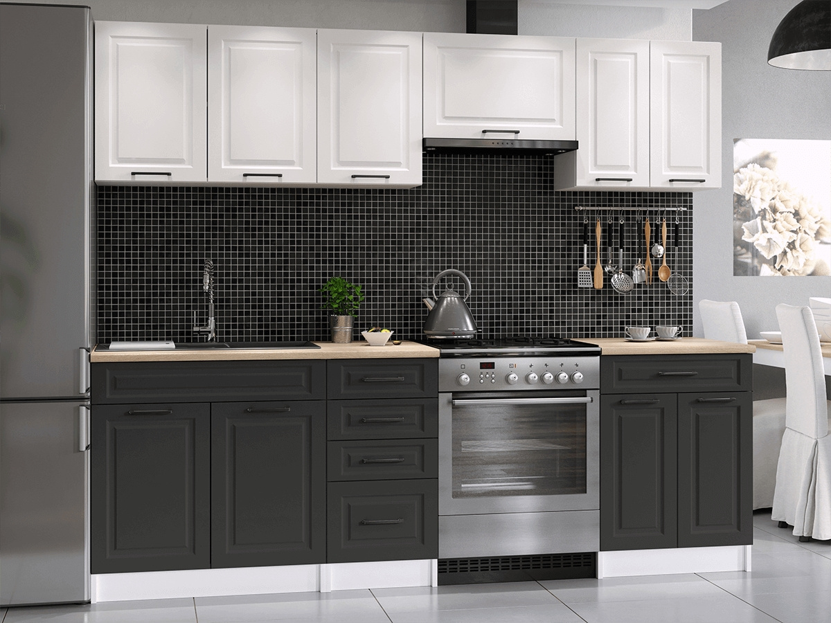 Kuchyňská linka Ilona je vyrobená ve venkovském stylu, který se hodí do kuchyně v paneláku i v rodinném domě. Tento styl má jedinečnou schopnost proměnit Vaši kuchyň v útulnou a zároveň funkční místnnost, kde bude radost vařit i péct. Kuchyňská linka Ilona nabízí dostatek úložného i pracovního prostoru. Všechny skříňky jsou samostatné, takže si je můžete sestavit tak, jak Vám to vyhovuje. Korpusy skříněk jsou vyrobené z lamina 18 mm s hranami ABS a dvířka jsou MDF 16mm. Všechny skříňky jsou dodávány v demontu. Součástí balení je montážní plánek včetně všech potřebných spojovacích prvků. Cena je uvedna za sestavu vyobrazenou na úvodní fotografii BEZ PRACOVNÍ DESKY, s úchytkami, které jsou vyobrazeny v doplňkových fotografiích. Pracovní desku lze dokoupit nad každou skříňku zvlášť podle její šíře. Vyobrazené spotřebiče, dřez, baterie, doplňky a dekorace nejsou v ceně. Kuchyň bude dodaná s bílými korpusy a dvířky v kombinaci bílá a grafit. Zobrazení barev na fotografii se může od skutečnosti lišit.