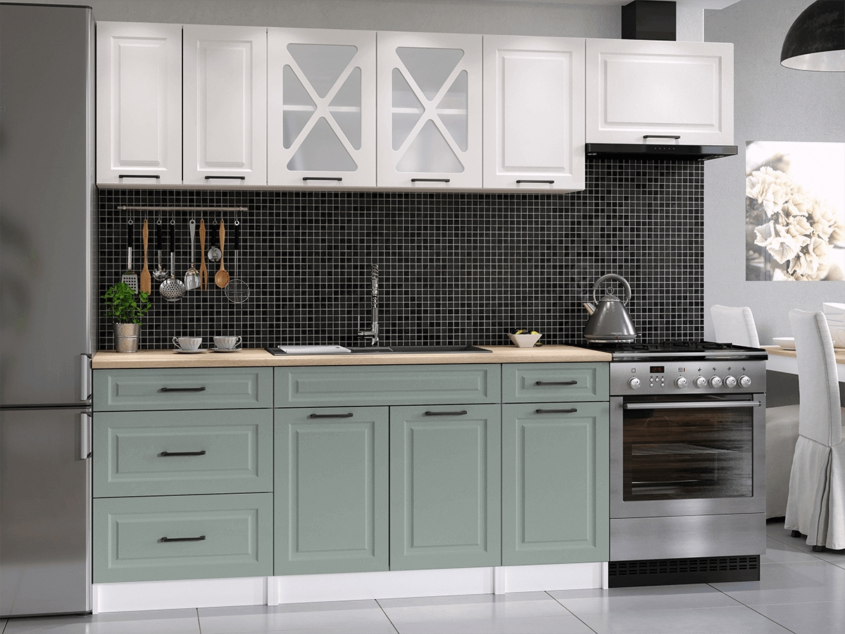 Kuchyňská linka Magda je vyrobená ve venkovském stylu, který se hodí do kuchyně v paneláku i v rodinném domě. Tento styl má jedinečnou schopnost proměnit Vaši kuchyň v útulnou a zároveň funkční místnnost, kde bude radost vařit i péct. Kuchyňská linka Magda nabízí dostatek úložného i pracovního prostoru. Všechny skříňky jsou samostatné, takže si je můžete sestavit tak, jak Vám to vyhovuje. Korpusy skříněk jsou vyrobené z lamina 18 mm s hranami ABS a dvířka jsou MDF 16mm. Všechny skříňky jsou dodávány v demontu. Součástí balení je montážní plánek včetně všech potřebných spojovacích prvků. Cena je uvedna za sestavu vyobrazenou na úvodní fotografii BEZ PRACOVNÍ DESKY, s úchytkami, které jsou vyobrazeny v doplňkových fotografiích. Pracovní desku lze dokoupit nad každou skříňku zvlášť podle její šíře. Vyobrazené spotřebiče, dřez, baterie, doplňky a dekorace nejsou v ceně. Kuchyň bude dodaná s bílými korpusy a dvířky v kombinaci bílá a světle zelená. Zobrazení barev na fotografii se může od skutečnosti lišit.
