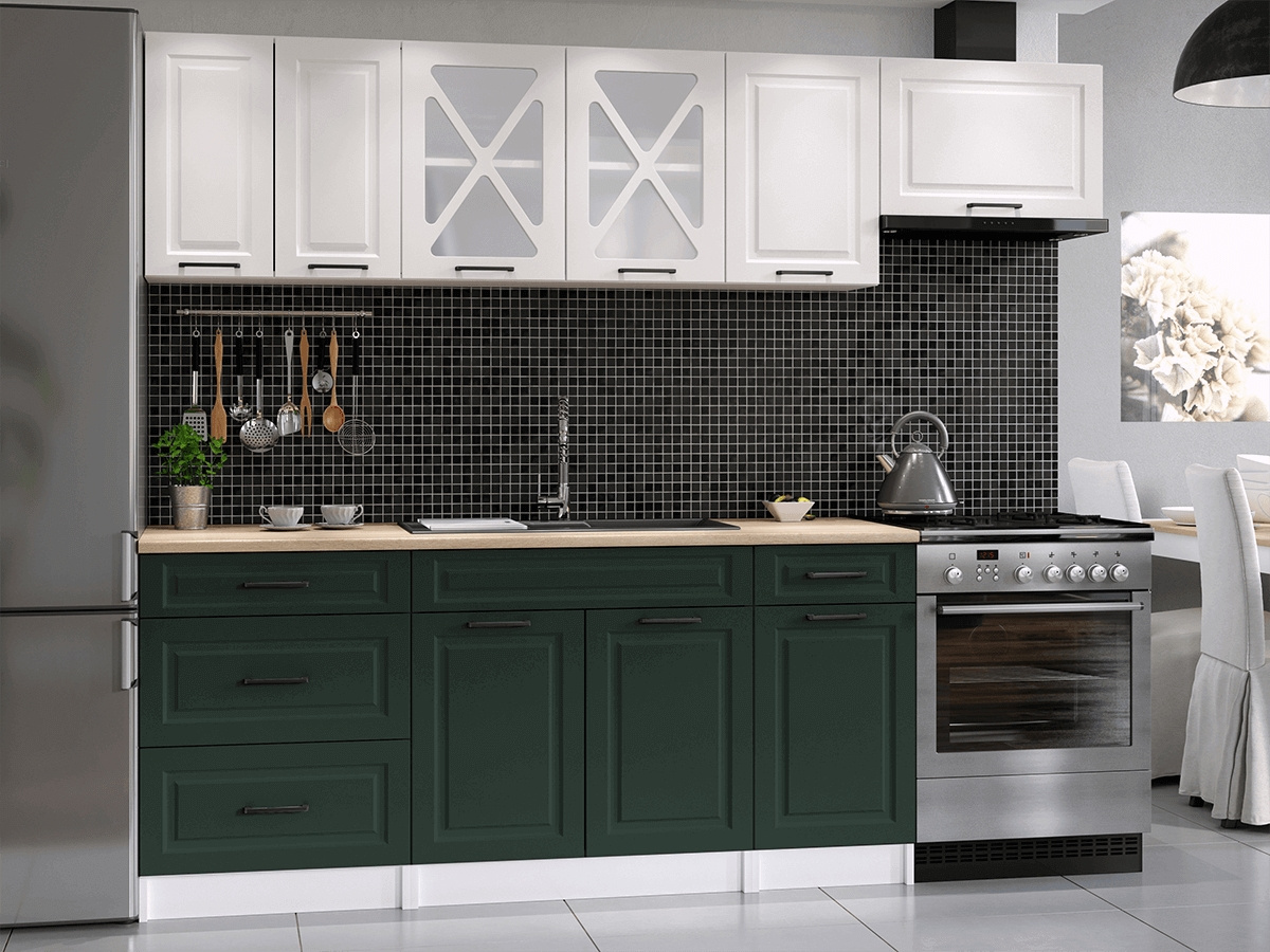 Kuchyňská linka Magda je vyrobená ve venkovském stylu, který se hodí do kuchyně v paneláku i v rodinném domě. Tento styl má jedinečnou schopnost proměnit Vaši kuchyň v útulnou a zároveň funkční místnnost, kde bude radost vařit i péct. Kuchyňská linka Magda nabízí dostatek úložného i pracovního prostoru. Všechny skříňky jsou samostatné, takže si je můžete sestavit tak, jak Vám to vyhovuje. Korpusy skříněk jsou vyrobené z lamina 18 mm s hranami ABS a dvířka jsou MDF 16mm. Všechny skříňky jsou dodávány v demontu. Součástí balení je montážní plánek včetně všech potřebných spojovacích prvků. Cena je uvedna za sestavu vyobrazenou na úvodní fotografii BEZ PRACOVNÍ DESKY, s úchytkami, které jsou vyobrazeny v doplňkových fotografiích. Pracovní desku lze dokoupit nad každou skříňku zvlášť podle její šíře. Vyobrazené spotřebiče, dřez, baterie, doplňky a dekorace nejsou v ceně. Kuchyň bude dodaná s bílými korpusy a dvířky v kombinaci bílá a tmavě zelená. Zobrazení barev na fotografii se může od skutečnosti lišit.