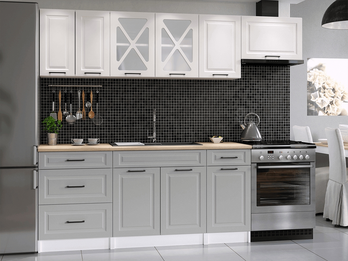 Kuchyňská linka Magda je vyrobená ve venkovském stylu, který se hodí do kuchyně v paneláku i v rodinném domě. Tento styl má jedinečnou schopnost proměnit Vaši kuchyň v útulnou a zároveň funkční místnnost, kde bude radost vařit i péct. Kuchyňská linka Magda nabízí dostatek úložného i pracovního prostoru. Všechny skříňky jsou samostatné, takže si je můžete sestavit tak, jak Vám to vyhovuje. Korpusy skříněk jsou vyrobené z lamina 18 mm s hranami ABS a dvířka jsou MDF 16mm. Všechny skříňky jsou dodávány v demontu. Součástí balení je montážní plánek včetně všech potřebných spojovacích prvků. Cena je uvedna za sestavu vyobrazenou na úvodní fotografii BEZ PRACOVNÍ DESKY, s úchytkami, které jsou vyobrazeny v doplňkových fotografiích. Pracovní desku lze dokoupit nad každou skříňku zvlášť podle její šíře. Vyobrazené spotřebiče, dřez, baterie, doplňky a dekorace nejsou v ceně. Kuchyň bude dodaná s bílými korpusy a dvířky v kombinaci bílá a šedá. Správný odstín šedé barvy je zobrazen v doplňkové fotografii. Zobrazení barev na fotografii se může od skutečnosti lišit.
