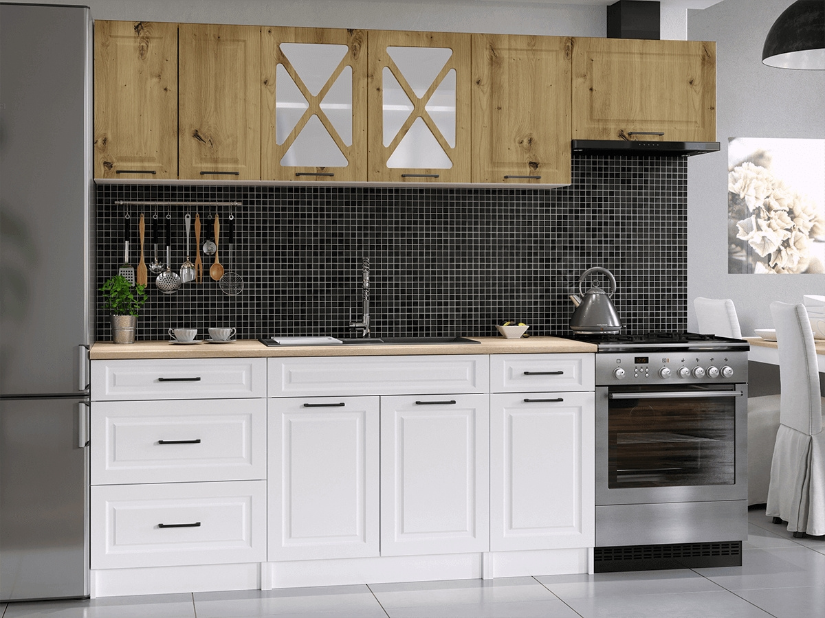 Kuchyňská linka Magda je vyrobená ve venkovském stylu, který se hodí do kuchyně v paneláku i v rodinném domě. Tento styl má jedinečnou schopnost proměnit Vaši kuchyň v útulnou a zároveň funkční místnnost, kde bude radost vařit i péct. Kuchyňská linka Magda nabízí dostatek úložného i pracovního prostoru. Všechny skříňky jsou samostatné, takže si je můžete sestavit tak, jak Vám to vyhovuje. Korpusy skříněk jsou vyrobené z lamina 18 mm s hranami ABS a dvířka jsou MDF 16mm. Všechny skříňky jsou dodávány v demontu. Součástí balení je montážní plánek včetně všech potřebných spojovacích prvků. Cena je uvedna za sestavu vyobrazenou na úvodní fotografii BEZ PRACOVNÍ DESKY, s úchytkami, které jsou vyobrazeny v doplňkových fotografiích. Pracovní desku lze dokoupit nad každou skříňku zvlášť podle její šíře. Vyobrazené spotřebiče, dřez, baterie, doplňky a dekorace nejsou v ceně. Kuchyň bude dodaná s bílými korpusy a dvířky v odstínu artisan a bílá. Zobrazení barev na fotografii se může od skutečnosti lišit.