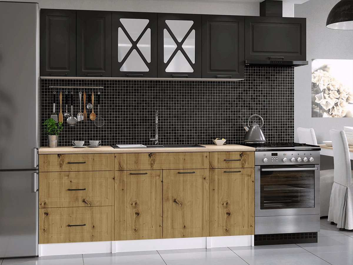 Kuchyňská linka Magda je vyrobená ve venkovském stylu, který se hodí do kuchyně v paneláku i v rodinném domě. Tento styl má jedinečnou schopnost proměnit Vaši kuchyň v útulnou a zároveň funkční místnnost, kde bude radost vařit i péct. Kuchyňská linka Magda nabízí dostatek úložného i pracovního prostoru. Všechny skříňky jsou samostatné, takže si je můžete sestavit tak, jak Vám to vyhovuje. Korpusy skříněk jsou vyrobené z lamina 18 mm s hranami ABS a dvířka jsou MDF 16mm. Všechny skříňky jsou dodávány v demontu. Součástí balení je montážní plánek včetně všech potřebných spojovacích prvků. Cena je uvedna za sestavu vyobrazenou na úvodní fotografii BEZ PRACOVNÍ DESKY, s úchytkami, které jsou vyobrazeny v doplňkových fotografiích. Pracovní desku lze dokoupit nad každou skříňku zvlášť podle její šíře. Vyobrazené spotřebiče, dřez, baterie, doplňky a dekorace nejsou v ceně. Kuchyň bude dodaná s bílými korpusy a dvířky v odstínu grafit a artisan. Zobrazení barev na fotografii se může od skutečnosti lišit.