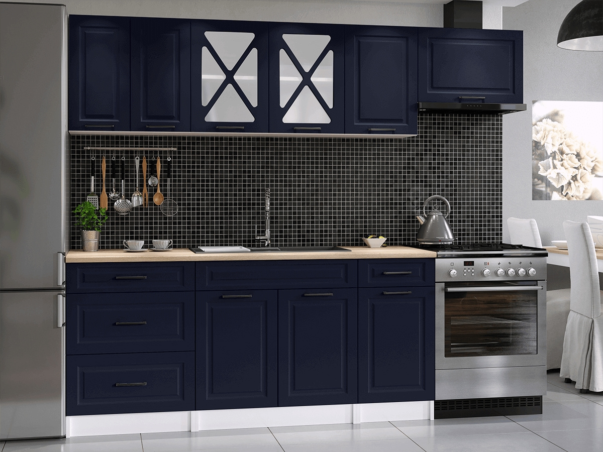 Kuchyňská linka Magda je vyrobená ve venkovském stylu, který se hodí do kuchyně v paneláku i v rodinném domě. Tento styl má jedinečnou schopnost proměnit Vaši kuchyň v útulnou a zároveň funkční místnnost, kde bude radost vařit i péct. Kuchyňská linka Magda nabízí dostatek úložného i pracovního prostoru. Všechny skříňky jsou samostatné, takže si je můžete sestavit tak, jak Vám to vyhovuje. Korpusy skříněk jsou vyrobené z lamina 18 mm s hranami ABS a dvířka jsou MDF 16mm. Všechny skříňky jsou dodávány v demontu. Součástí balení je montážní plánek včetně všech potřebných spojovacích prvků. Cena je uvedna za sestavu vyobrazenou na úvodní fotografii BEZ PRACOVNÍ DESKY, s úchytkami, které jsou vyobrazeny v doplňkových fotografiích. Pracovní desku lze dokoupit nad každou skříňku zvlášť podle její šíře. Vyobrazené spotřebiče, dřez, baterie, doplňky a dekorace nejsou v ceně. Kuchyň bude dodaná s bílými korpusy a dvířky ve tmavě modré barvě. Zobrazení barev na fotografii se může od skutečnosti lišit.