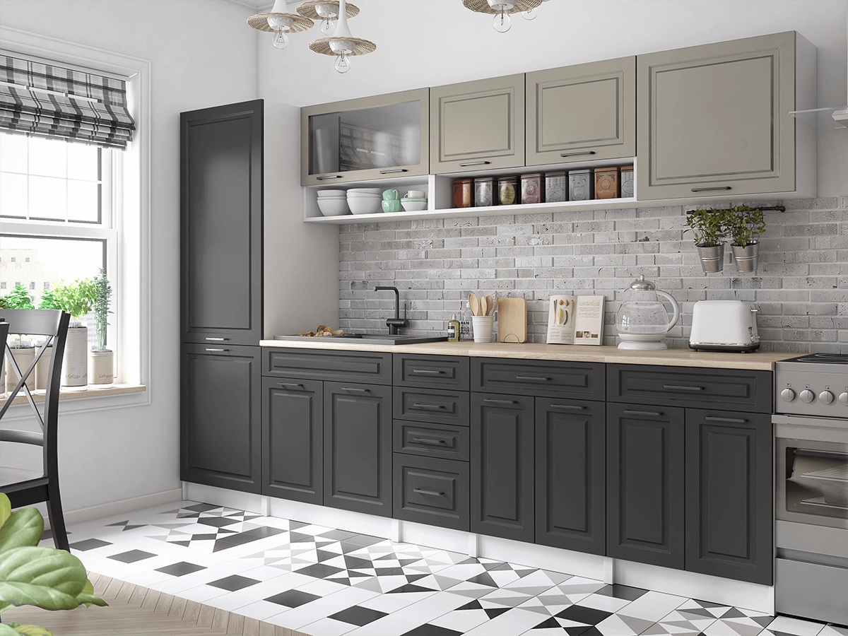 Kuchyňská linka Brigita je vyrobená ve venkovském stylu, který se hodí do kuchyně v paneláku i v rodinném domě. Tento styl má jedinečnou schopnost proměnit Vaši kuchyň v útulnou a zároveň funkční místnost, kde bude radost vařit i péct. Kuchyňská linka Brigita nabízí dostatek úložného i pracovního prostoru. Všechny skříňky jsou samostatné, takže si je můžete sestavit tak, jak Vám to vyhovuje. Korpusy skříněk jsou vyrobené z lamina 18 mm s hranami ABS a dvířka jsou MDF 16mm. Všechny skříňky jsou dodávány v demontu. Součástí balení je montážní plánek včetně všech potřebných spojovacích prvků. Cena je uvedena za sestavu vyobrazenou na úvodní fotografii BEZ PRACOVNÍ DESKY, s úchytkami, které jsou vyobrazeny v doplňkových fotografiích. Pracovní desku lze dokoupit nad každou skříňku zvlášť podle její šíře. Vyobrazené spotřebiče, dřez, baterie, doplňky a dekorace nejsou v ceně. Kuchyň bude dodaná s bílými korpusy a dvířky v kombinaci šedá a grafit. Zobrazení barev na fotografii se může od skutečnosti lišit.
