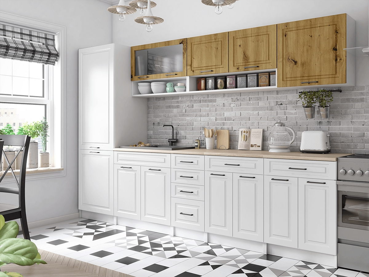 Kuchyňská linka Brigita je vyrobená ve venkovském stylu, který se hodí do kuchyně v paneláku i v rodinném domě. Tento styl má jedinečnou schopnost proměnit Vaši kuchyň v útulnou a zároveň funkční místnost, kde bude radost vařit i péct. Kuchyňská linka Brigita nabízí dostatek úložného i pracovního prostoru. Všechny skříňky jsou samostatné, takže si je můžete sestavit tak, jak Vám to vyhovuje. Korpusy skříněk jsou vyrobené z lamina 18 mm s hranami ABS a dvířka jsou MDF 16mm. Všechny skříňky jsou dodávány v demontu. Součástí balení je montážní plánek včetně všech potřebných spojovacích prvků. Cena je uvedena za sestavu vyobrazenou na úvodní fotografii BEZ PRACOVNÍ DESKY, s úchytkami, které jsou vyobrazeny v doplňkových fotografiích. Pracovní desku lze dokoupit nad každou skříňku zvlášť podle její šíře. Vyobrazené spotřebiče, dřez, baterie, doplňky a dekorace nejsou v ceně. Kuchyň bude dodaná s bílými korpusy a dvířky v kombinaci artisan a bílá. Zobrazení barev na fotografii se může od skutečnosti lišit.