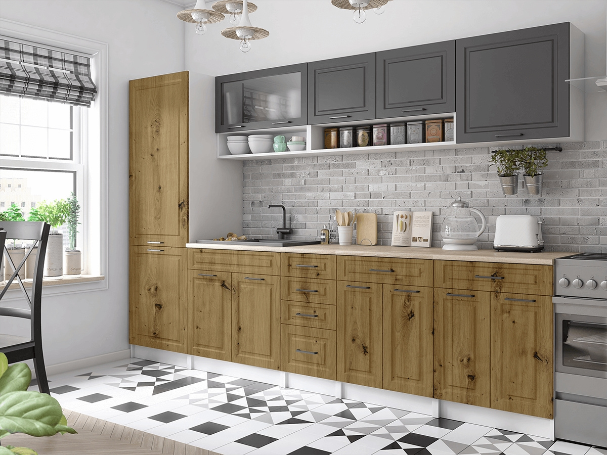 Kuchyňská linka Brigita je vyrobená ve venkovském stylu, který se hodí do kuchyně v paneláku i v rodinném domě. Tento styl má jedinečnou schopnost proměnit Vaši kuchyň v útulnou a zároveň funkční místnost, kde bude radost vařit i péct. Kuchyňská linka Brigita nabízí dostatek úložného i pracovního prostoru. Všechny skříňky jsou samostatné, takže si je můžete sestavit tak, jak Vám to vyhovuje. Korpusy skříněk jsou vyrobené z lamina 18 mm s hranami ABS a dvířka jsou MDF 16mm. Všechny skříňky jsou dodávány v demontu. Součástí balení je montážní plánek včetně všech potřebných spojovacích prvků. Cena je uvedena za sestavu vyobrazenou na úvodní fotografii BEZ PRACOVNÍ DESKY, s úchytkami, které jsou vyobrazeny v doplňkových fotografiích. Pracovní desku lze dokoupit nad každou skříňku zvlášť podle její šíře. Vyobrazené spotřebiče, dřez, baterie, doplňky a dekorace nejsou v ceně. Kuchyň bude dodaná s bílými korpusy a dvířky v kombinaci grafit a artisan. Zobrazení barev na fotografii se může od skutečnosti lišit.