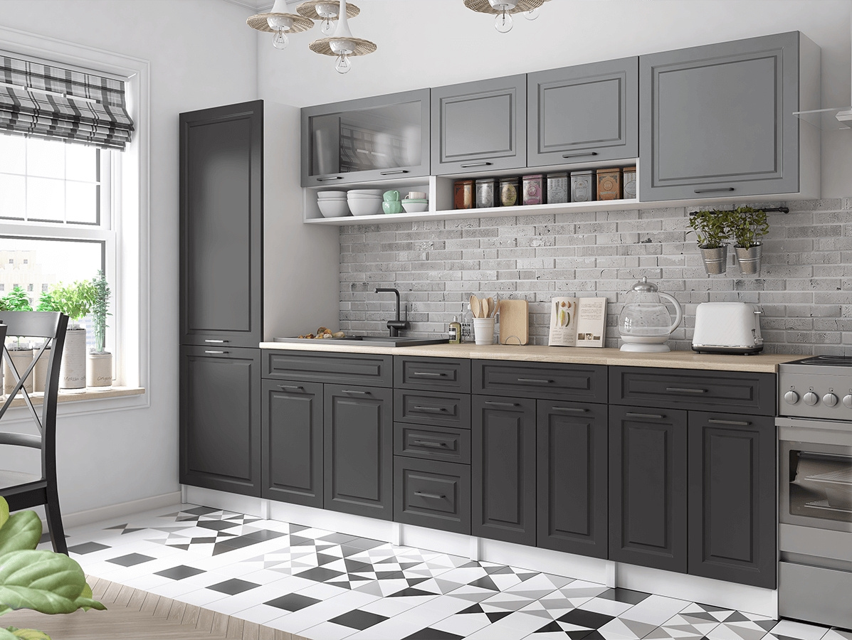 Kuchyňská linka Brigita je vyrobená ve venkovském stylu, který se hodí do kuchyně v paneláku i v rodinném domě. Tento styl má jedinečnou schopnost proměnit Vaši kuchyň v útulnou a zároveň funkční místnost, kde bude radost vařit i péct. Kuchyňská linka Brigita nabízí dostatek úložného i pracovního prostoru. Všechny skříňky jsou samostatné, takže si je můžete sestavit tak, jak Vám to vyhovuje. Korpusy skříněk jsou vyrobené z lamina 18 mm s hranami ABS a dvířka jsou MDF 16mm. Všechny skříňky jsou dodávány v demontu. Součástí balení je montážní plánek včetně všech potřebných spojovacích prvků. Cena je uvedena za sestavu vyobrazenou na úvodní fotografii BEZ PRACOVNÍ DESKY, s úchytkami, které jsou vyobrazeny v doplňkových fotografiích. Pracovní desku lze dokoupit nad každou skříňku zvlášť podle její šíře. Vyobrazené spotřebiče, dřez, baterie, doplňky a dekorace nejsou v ceně. Kuchyň bude dodaná s bílými korpusy a dvířky v šedém a grafit odstínu. Zobrazení barev na fotografii se může od skutečnosti lišit.