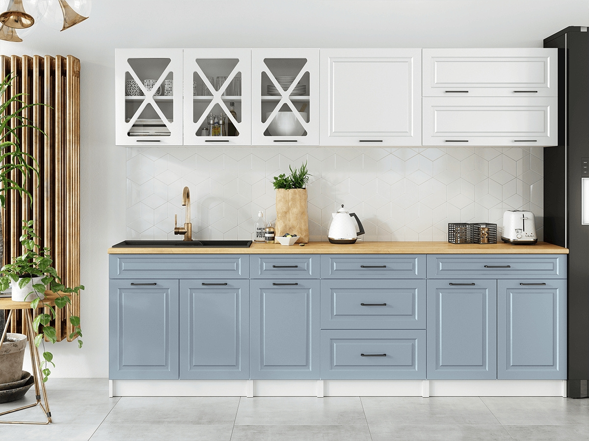 Kuchyňská linka Tyra je vyrobená ve velmi oblíbeném skandinávském stylu, který se hodí do kuchyně v paneláku i v rodinném domě. Tento styl má jedinečnou schopnost proměnit Vaši kuchyň v útulnou a zároveň funkční místnost, kde bude radost vařit i péct. Kuchyňská linka Tyra nabízí dostatek úložného i pracovního prostoru. Všechny skříňky jsou samostatné, takže si je můžete sestavit tak, jak Vám to vyhovuje. Korpusy skříněk jsou vyrobené z lamina 18 mm s hranami ABS a dvířka jsou MDF 16mm. Všechny skříňky jsou dodávány v demontu. Součástí balení je montážní plánek včetně všech potřebných spojovacích materiálů. Cena je uvedena za sestavu vyobrazenou na úvodní fotografii BEZ PRACOVNÍ DESKY, s úchytkami, které jsou vyobrazeny v doplňkových fotografiích. Pracovní desku lze dokoupit nad každou skříňku zvlášť podle její šíře. Vyobrazené spotřebiče, dřez, baterie, doplňky a dekorace nejsou v ceně. Zobrazení barev na fotografii se může od skutečnosti lišit.