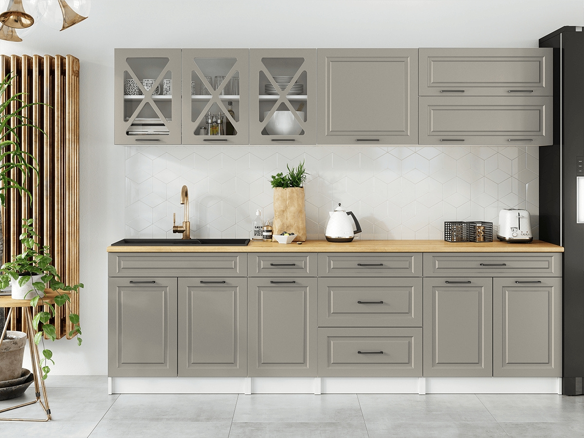 Kuchyňská linka Tyra je vyrobená ve velmi oblíbeném skandinávském stylu, který se hodí do kuchyně v paneláku i v rodinném domě. Tento styl má jedinečnou schopnost proměnit Vaši kuchyň v útulnou a zároveň funkční místnost, kde bude radost vařit i péct. Kuchyňská linka Tyra nabízí dostatek úložného i pracovního prostoru. Všechny skříňky jsou samostatné, takže si je můžete sestavit tak, jak Vám to vyhovuje. Korpusy skříněk jsou vyrobené z lamina 18 mm s hranami ABS a dvířka jsou MDF 16mm. Všechny skříňky jsou dodávány v demontu. Součástí balení je montážní plánek včetně všech potřebných spojovacích materiálů. Cena je uvedena za sestavu vyobrazenou na úvodní fotografii BEZ PRACOVNÍ DESKY, s úchytkami, které jsou vyobrazeny v doplňkových fotografiích. Pracovní desku lze dokoupit nad každou skříňku zvlášť podle její šíře. Vyobrazené spotřebiče, dřez, baterie, doplňky a dekorace nejsou v ceně. Zobrazení barev na fotografii se může od skutečnosti lišit.